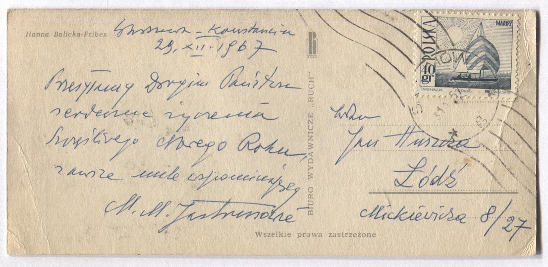 [JASTRUN Mieczysław]. Odręczne życzenia noworoczne Mieczysława Jastruna przesłane poecie i satyrykowi Janowi Huszczy w Łodzi na pocztówce, dat. 29 XII 1967 w Warszawie-Konstancinie.
