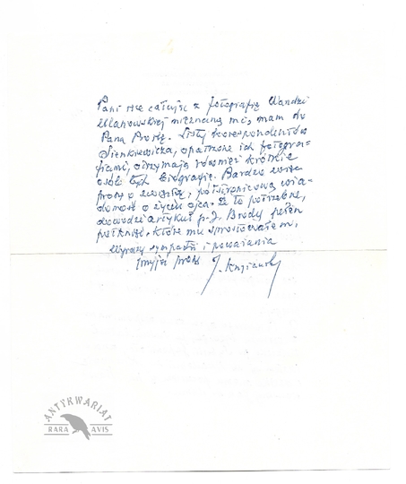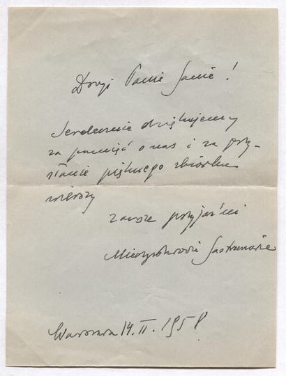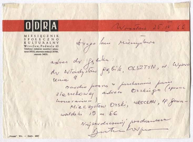[KARPOWICZ Tymoteusz]. Odręczny list Tymoteusza Karpowicza do niewymienionej z nazwiska Mieczysławy, dat. 25 IV 1966 we Wrocławiu.