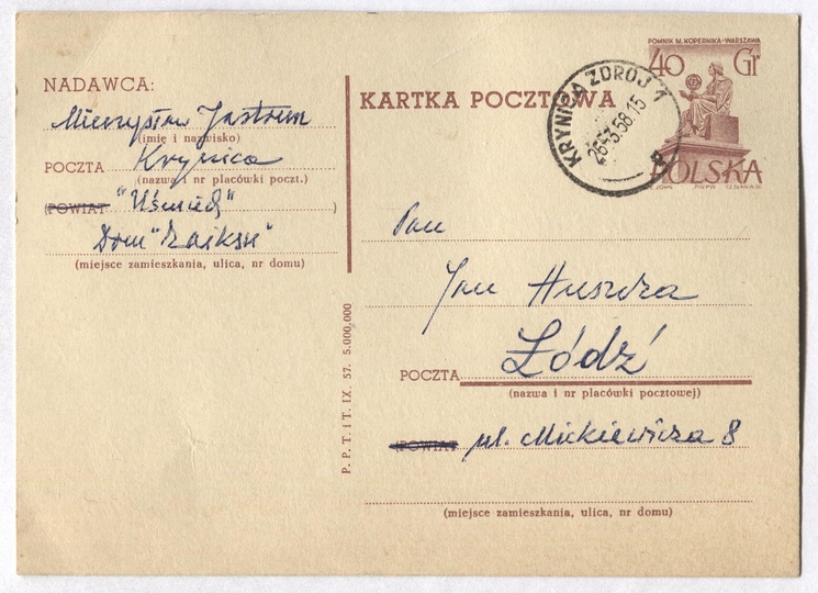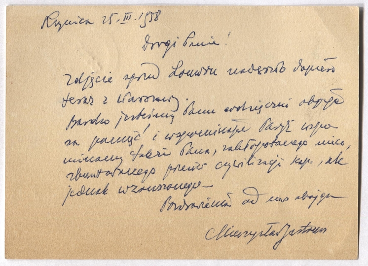 [JASTRUN Mieczysław]. Odręczny list Mieczysława Jastruna do poety i satyryka Jana Huszczy w Łodzi, dat. 25 III 1958 w Krynicy.