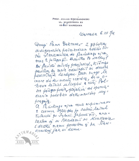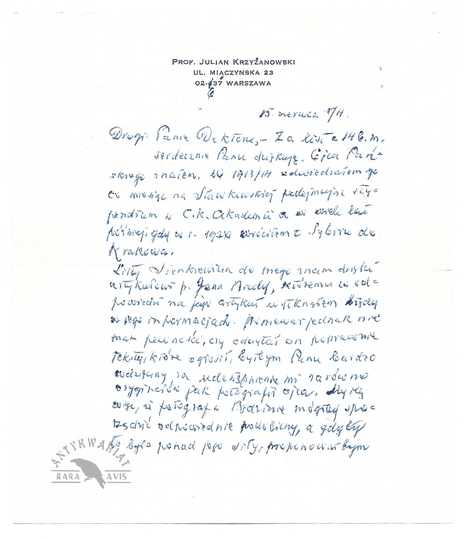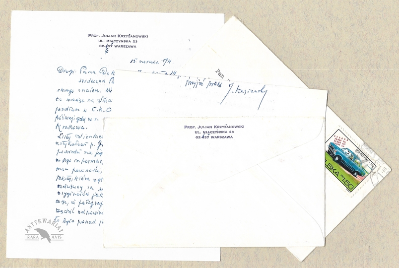 [KRZYŻANOWSKI Julian]. Dwa odręczne listy Juliana Krzyżanowskiego do Jana Rydla w Będzinie, dat. 15 VI i 6 VII 1974, wysłane z Warszawy.