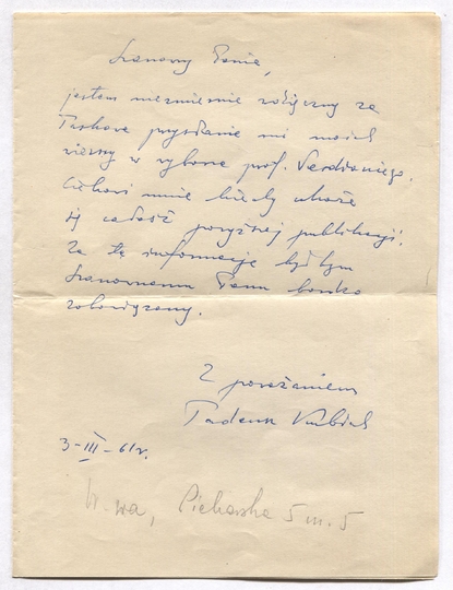 [KUBIAK Tadeusz]. List odręczny Tadeusza Kubiaka do nieznanego adresata, dat. 3 III 1961.