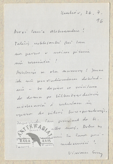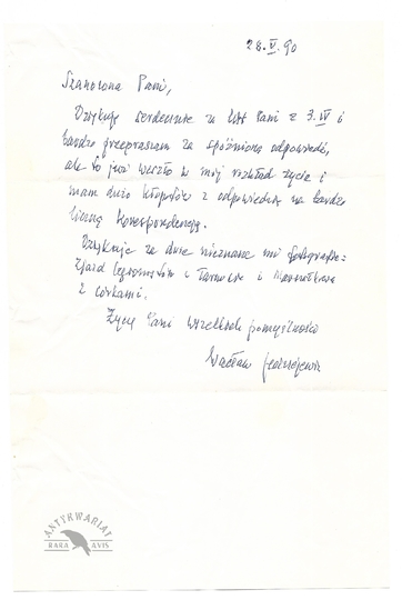 [SZYMBORSKA Wisława]. Wyklejanka z odręcznym listem Wisławy Szymborskiej do Aleksandra Rybczyńskiego w Toronto na odwrocie, dat. 26 VII 1996 w Krakowie.