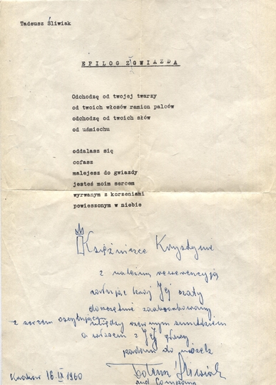 [ŚLIWIAK Tadeusz]. Maszynopis wiersza Tadeusza Śliwiaka "Epilog z gwiazdą" z jego odręczną dedykacją dla niewymienionej z nazwiska Krystyny, dat. 16 IX 1960 w Krakowie.