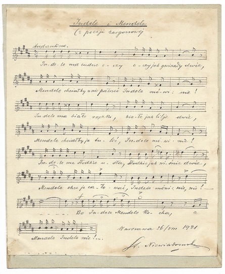 [NIEWIADOMSKI Stanisław]. Rękopiśmienne nuty (i tekst) piosenki "Indele i Mendele" skomponowanej przez Stanisława Niewiadomskiego.