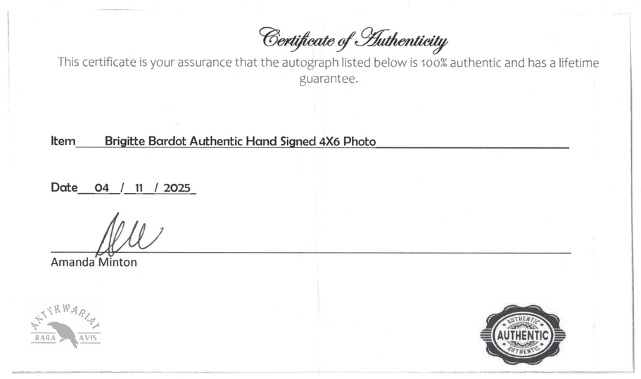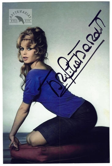 [BARDOT Brigitte]. Podpis Brigitte Bardot na barwnej fotografii.