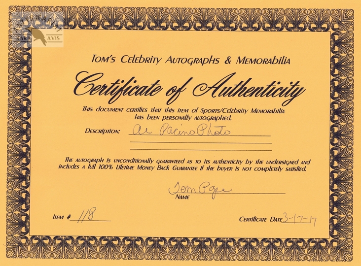 [PACINO Al]. Podpis Ala Pacino na fotosie z filmu "Człowiek z blizną".