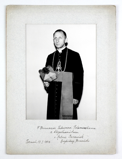 [BARANIAK Antoni]. Odręczna dedykacja Antoniego Baraniaka, arcybiskupa poznańskiego, pod zdjęciem portretowym, dat. 17 I 1958 w Poznaniu.