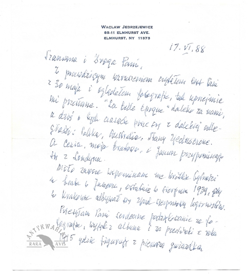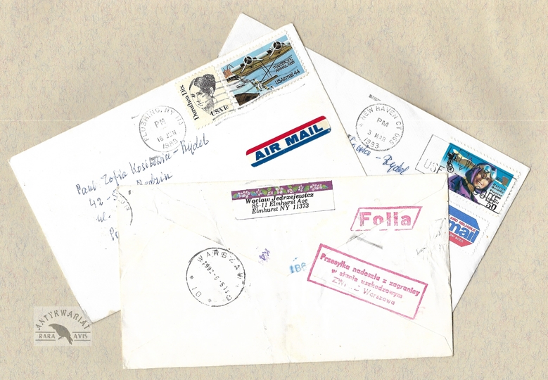 [JĘDRZEJEWICZ Wacław]. Trzy odręczne listy Wacława Jędrzejewicza do Zofii Kosibowicz-Rydel w Będzinie, dat. 17 VI 1988, 28 V 1990 i 2 III 1993, wysłane z Elmhurst (USA).