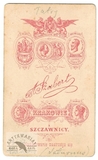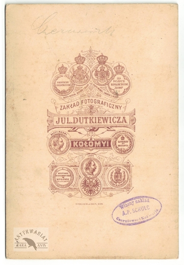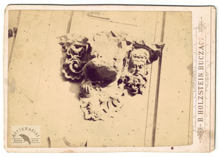 [KRESY - BUCZACZ - konsola balkonowa ratusza miejskiego - fotografia widokowa - ujęcie w formacie gabinetowym]. [ok. 1880]. Fotografia form. 10,1x13,7 cm na oryg. podkładzie form. 11x15,9 cm, wykonana w zakładzie Bernharda Holzsteina w Buczaczu.
