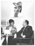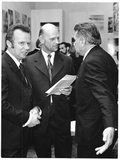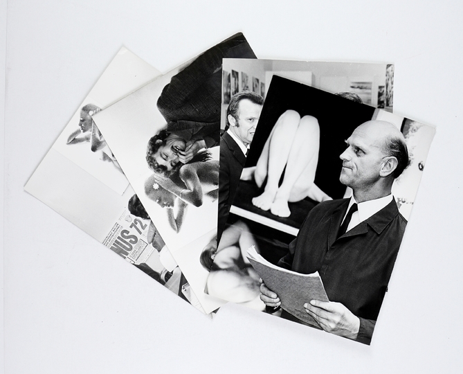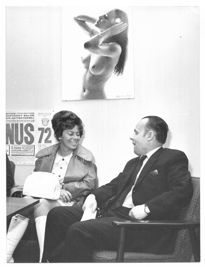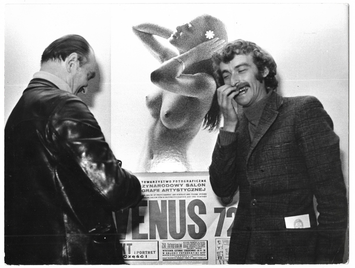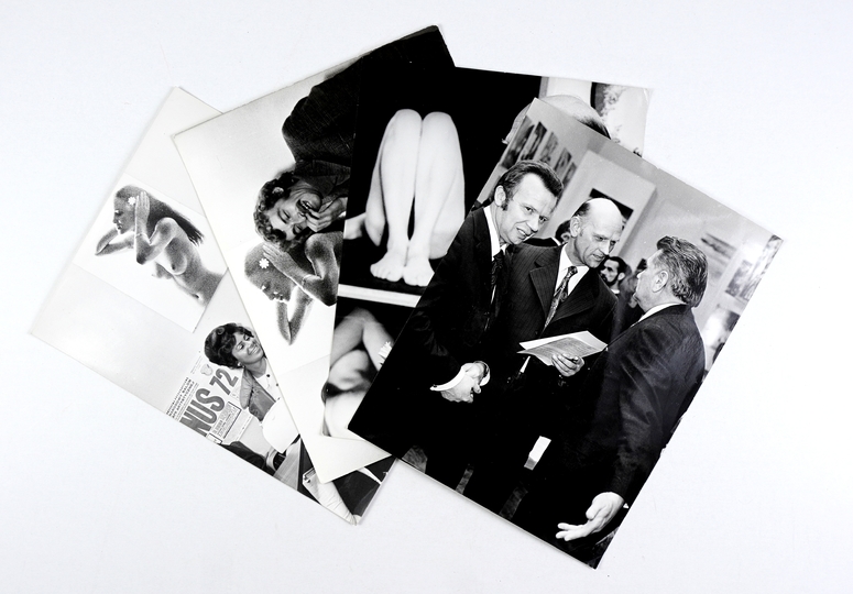 [KLIMCZAK Władysław - Venus 72]. Cztery zdjęcia przedstawiające organizatora cyklu wystaw aktu kobiecego Władysława Klimczaka i osoby zwiedzające ekspozycję.