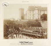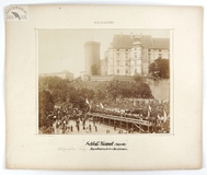 [KRAKÓW - uroczystość przeniesienia prochów Adama Mickiewicza na Wawel - fotografia sytuacyjna - ujęcie w dużym formacie]. [4 VII 1890]. Fotografia form. 20,9x26,6 cm na oryg. podkładzie form. 32,5x40 cm, z zakładu Stanisława Bizańskiego.