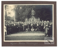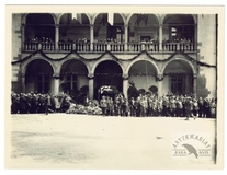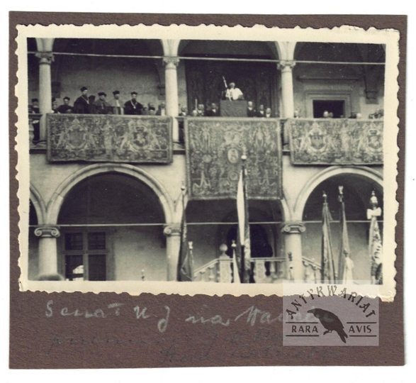 [KRAKÓW - przemowa rektora UJ Stanisława Kutrzeby na Wawelu - fotografia sytuacyjna]. [18 VI 1933]. Fotografia form. 6,1x8,7 cm na podkładzie form. 8x9 cm.