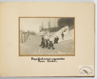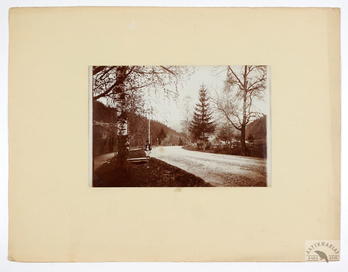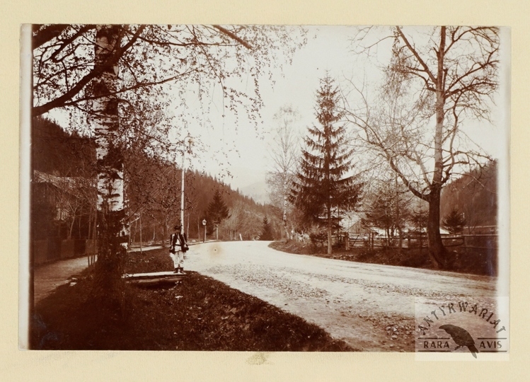 [GÓRY - Karpaty - Beskidy Wschodnie - Hucuł przy drodze - fotografia pozowana, widokowa]. [pocz. XX w.]. Fotografia form. 11,9x17,9 cm na karcie z albumu form. 25x32,5 cm.