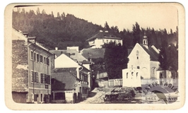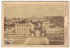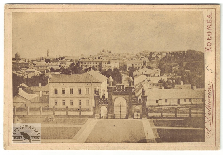 [KRESY - CZERNIOWCE - fragment panoramy miasta - fotografia widokowa - ujęcie w formacie gabinetowym]. [nie przed 1871]. Fotografia form. 9,7x14,2 cm na oryg. podkładzie form. 10,8x16 cm, autorstwa J[uliusza] Dutkiewicza w Kołomyi.