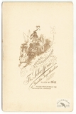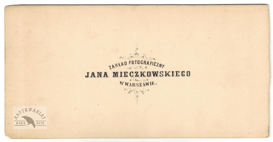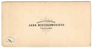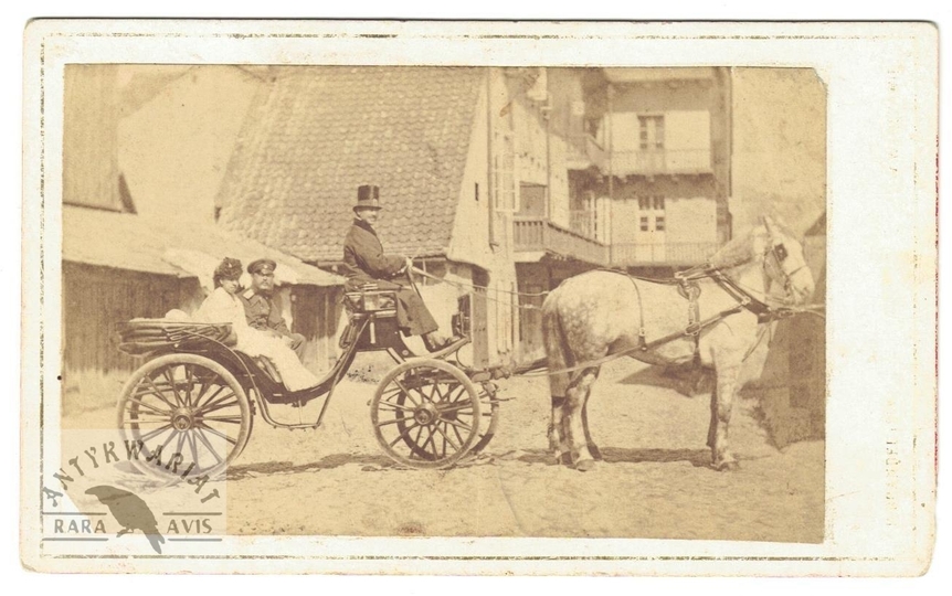 [WARSZAWA - dorożka z klientami na tyłach atelier Konrada Brandla - fotografia widokowa, sytuacyjna - ujęcie w formacie cdv]. [ok. 1870]. Fotografia form. 5,4x8,8 cm na oryg. podkładzie form. 6,5x10,5 cm, autorstwa K[onrada] Brandla w Warszawie.