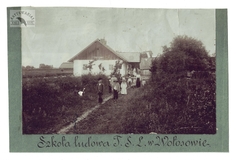 [KRESY - WOŁOSÓW - widok na Szkołę Ludową im. Tadeusza Kościuszki - fotografia widokowa, sytuacyjna]. [pocz. XX w.]. Fotografia form. ca 11x17 cm na kartonie form. ca 12,5x19 cm.