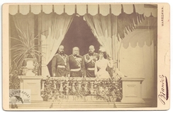[SKIERNIEWICE - zjazd trzech cesarzy: Franciszka Józefa – cesarza Austro-Wegier, Wilhelma I – cesarza Niemiec i Aleksandra III – cara Rosji w Skierniewicach - fotografia pozowana]. [15 IX 1884]. Fotografia form. 10,1x14,8 cm na oryg. podkładzie form. 10,7x16,4 cm, autorstwa [Konrada] Brandla w Warszawie.