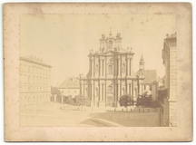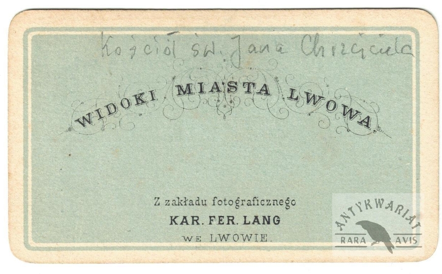 [LWÓW - kościół św. Jana Chrzciciela - fotografia widokowa - ujęcie w formacie cdv]. [nie przed 1863, nie po 1870]. Fotografia form. 5,5x9,4 cm na oryg. podkładzie form. 6x10,3 cm, autorstwa Kar[ola] Ferd[ynanda] Langa we Lwowie.