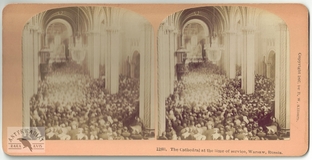 [WARSZAWA - wnętrze katedry św. Jana Chrzciciela podczas mszy - fotografia widokowa - stereoskopowa]. [1897]. Fotografia form. 7,7x7,7 cm razy dwa na oryg. podkładzie form. 8,9x17,8 cm, autorstwa Melecjusza Dutkiewicza w Warszawie, wydane przez firmę Kilburn Brothers Stereoscopic View Company w Littleton.