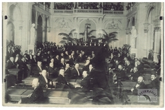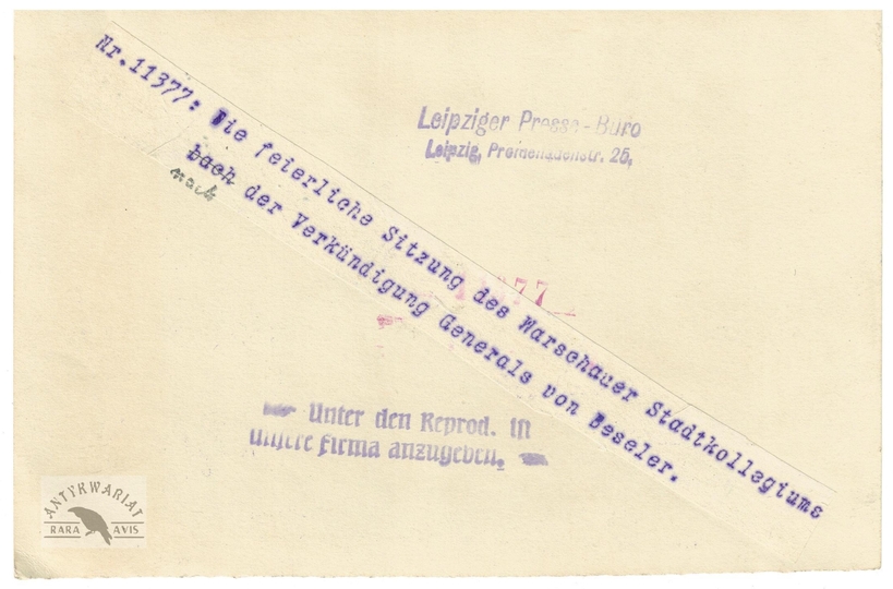 [WARSZAWA - przemowa generalnego gubernatora Hansa Hartwiga von Beselera podczas uroczystego posiedzenia Rady Miejskiej, proklamująca aktem 5 listopada utworzenie Królestwa Polskiego - fotografia prasowa]. [5 XI 1916]. Fotografia form. 12,1x17,9 cm, wykonana na zlecenie Lipskiego Biura Prasowego.