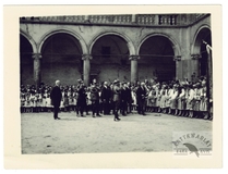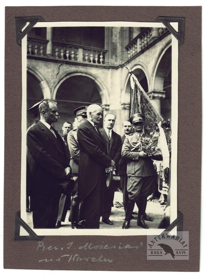 [MOŚCICKI Ignacy - prezydent RP na dziedzińcu Zamku Królewskiego na Wawelu - fotografia sytuacyjna]. [VII 1929]. Fotografia form. 11,2x8,2 cm na podkładzie form. 13,8x10,2 cm, nieznanego autorstwa.