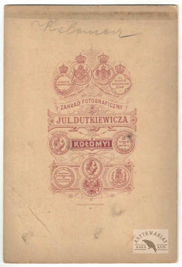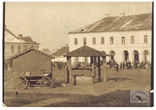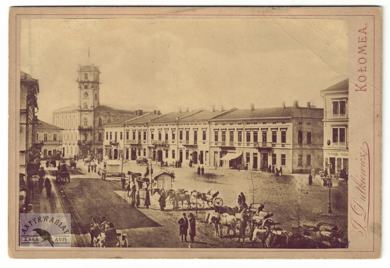 [KRESY - KOŁOMYJA - rynek - fotografia widokowa, sytuacyjna - ujęcie w formacie gabinetowym]. [nie przed 1871]. Fotografia form. 9,8x14 cm na oryg. podkładzie form. 10,8x16 cm, autorstwa J[uliusza] Dutkiewicza w Kołomyi.