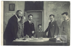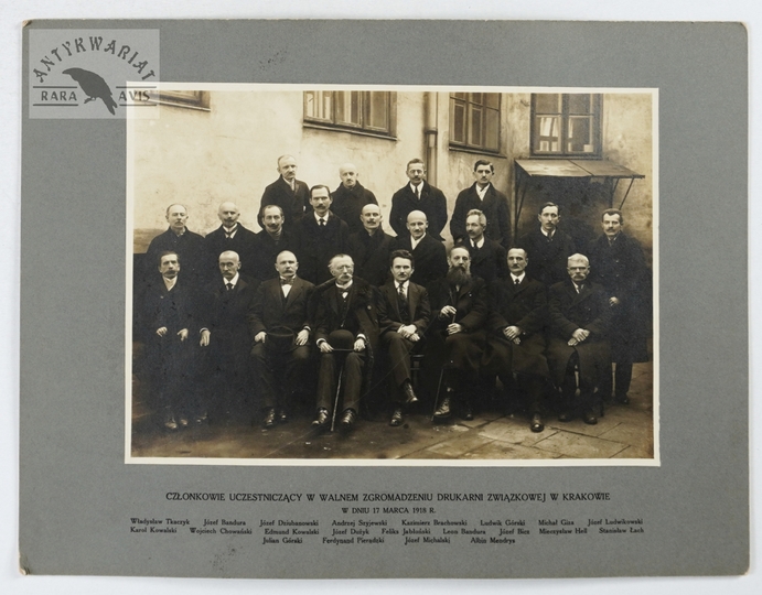 [KRAKÓW - "Członkowie uczestniczący w Walnem Zgromadzeniu Drukarni Związkowej w Krakowie w dniu 17 marca 1918 r. - fotografia zbiorowa, sytuacyjna]. [17 III 1918]. Fotografia form. 17x23,8 cm na oryg. podkładzie form. 24,5x32,5 cm, autorstwa Antoniego Pawlikowskiego w Krakowie.