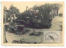 [II WOJNA św. - powstanie warszawskie - przewrócony tramwaj - fotografia sytuacyjna]. [nie przed VIII 1944]. Fotografia form. ca 6x8,5 cm, nieznanego autorstwa.