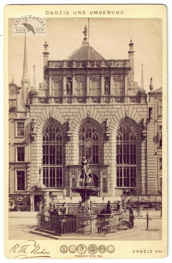 [GDAŃSK - Dwór Artusa i fontanna Neptuna - fotografia widokowa - ujęcie w formacie gabinetowym]. [1891]. Fotografia form. 14,3x10 cm na oryg. podkładzie form. 16,5x10,7 cm, autorstwa R. Th[eodora] Kuhna.