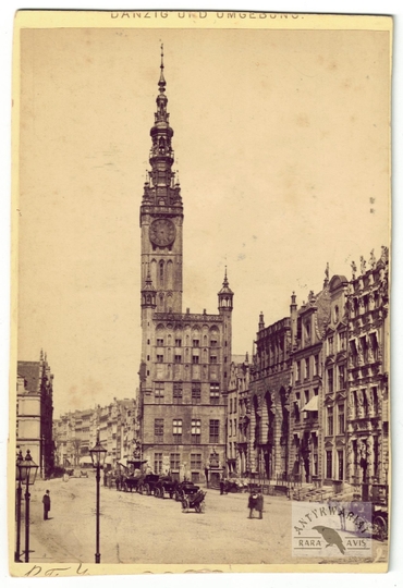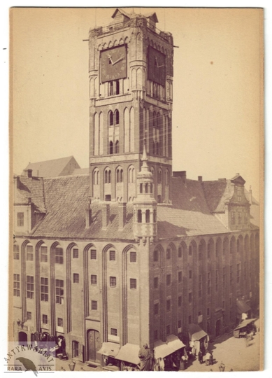 [GDAŃSK - Ratusz Głównego Miasta - fotografia widokowa, sytuacyjna - ujęcie w formacie gabinetowym]. [1891]. Fotografia form. 14,5x10 cm na oryg. podkładzie form. 15,2x10,3 cm, autorstwa R. Th[eodora] Kuhna.