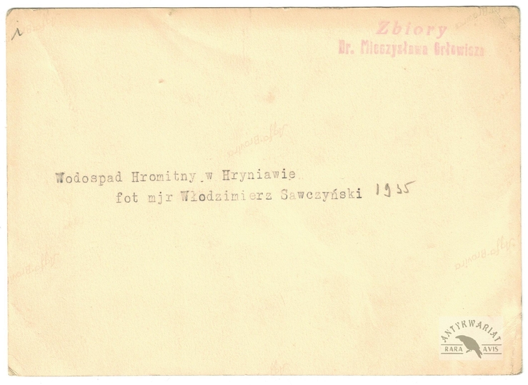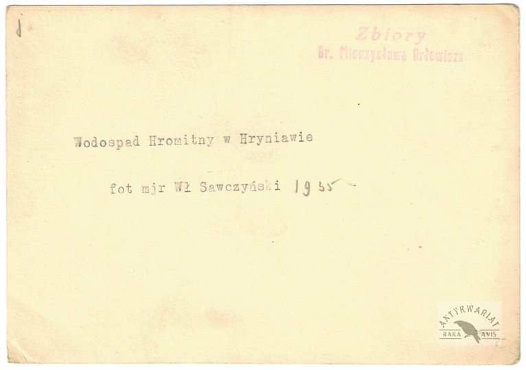 [GÓRY - Karpaty - Beskidy Wschodnie - Połoniny Hryniawskie - wodospad Hromitny w Hryniawie - fotografia widokowa]. [1935]. Fotografia form. 17,6x12,3 cm, autorstwa Wł[odzimierza] Sawczyńskiego.