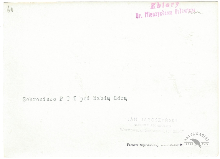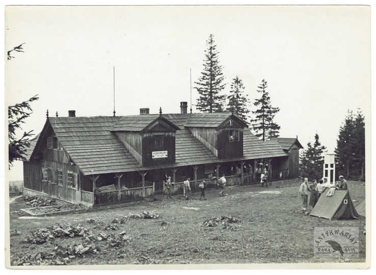 [GÓRY - Karpaty - Beskidy Zachodnie, Beskid Żywiecki - schronisko Polskiego Towarzystwa Tatrzańskiego na Markowych Szczawinach pod Babią Górą im. Hugona Zapałowicza - fotografia widokowa, sytuacyjna]. [1. poł. l. 30. XX w.]. Fotografia form. 13x18 cm, autorstwa Jana Jaroszyńskiego.