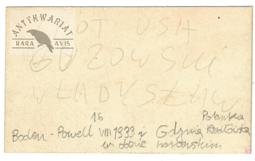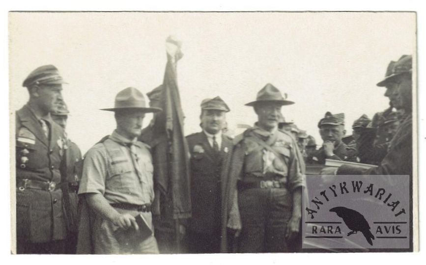 [HARCERSTWO - Naczelny Skaut Świata Robert Baden-Powell z wizytą w Polsce - fotografia sytuacyjna, pozowana]. [16 VIII 1933]. Fotografia form. 4,9x8,3 cm, nieznanego autorstwa.
