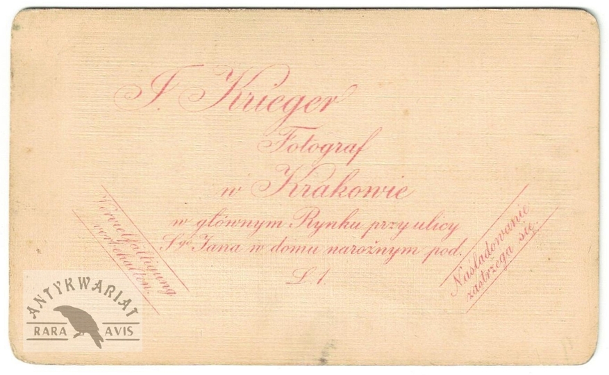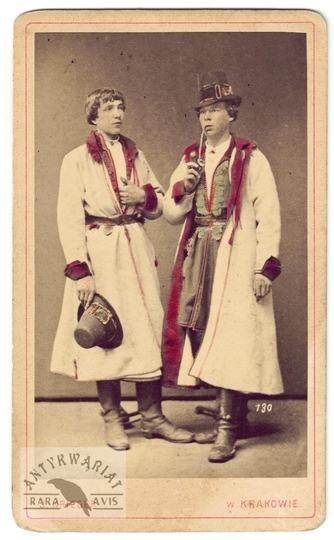 [KRAKÓW - dwaj młodzi mężczyźni w strojach krakowskich - fotografia portretowa, pozowana - ujęcie w formacie cdv]. [ok. 1870]. Fotografia form. 9,2x5,6 cm na oryg. podkładzie form. 10,8x6,5 cm, autorstwa J[gnacego] Kriegera w Krakowie.