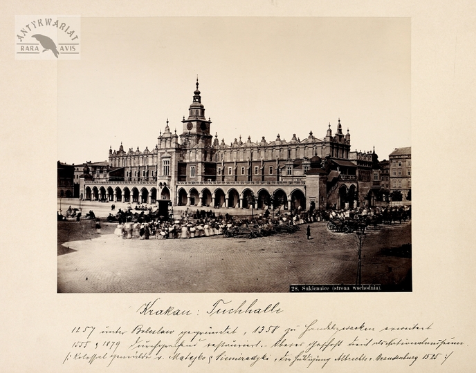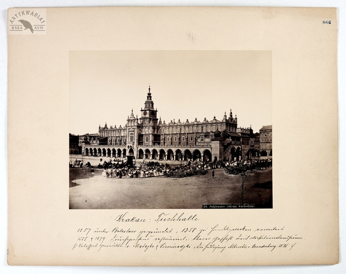 [KRAKÓW - Sukiennice (strona wschodnia) - fotografia widokowa - ujęcie w dużym formacie]. [zapewne przed 1882]]. Fotografia form. 19,3x25 cm na oryg. podkładzie form. 31,5x40,5 cm, autorstwa J[gnacego] Kriegera w Krakowie.