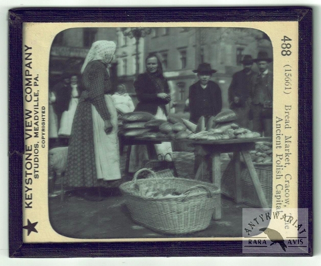 [KRAKÓW - targ chlebowy w Rynku Głównym - klisza szklana]. [ok. 1919]. Diapozytyw na kliszy szklanej form. 8,2x10 cm do fotografii stereoskopowej firmy Keystone View Company.