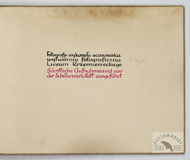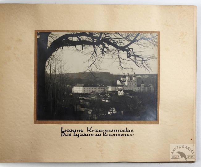 [KRZEMIENIEC i Liceum Krzemienieckie w obiektywie Uczniowskiej Wytwórni Fotograficznej pod kierownictwem Stanisława Sheybala]. [1929]. Album zaw. 21 fotografii form. ca 13,5x19 cm, 13x17 cm, 18,5x12 cm, 15,5x17 cm, 11,5x16,5 cm.