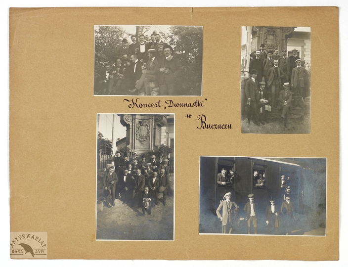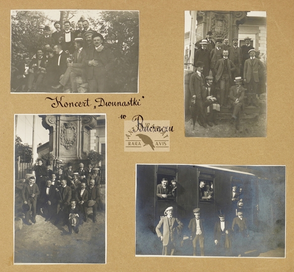 [KRESY - BUCZACZ - koncert "Dwunastki" w Buczaczu - fotografie zbiorowe, pozowane, sytuacyjne]. [1. poł. XX w.]. Zestaw 4 fotografii form. ca 12x8 cm, 7x10,5 cm na kartonie form. ca 25x32,5 cm.