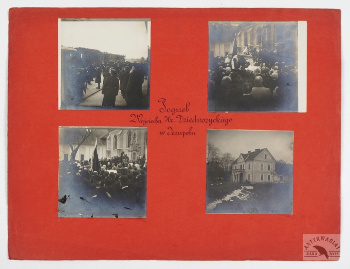 [KRESY - JEZUPOL - pogrzeb hr. Wojciecha Dzieduszyckiego - fotografie widokowe, sytuacyjne]. [III 1909]. Zestaw 4 fotografii form. ca 9x9 cm, 8x8 cm na kartonie form. ca 25x33 cm.