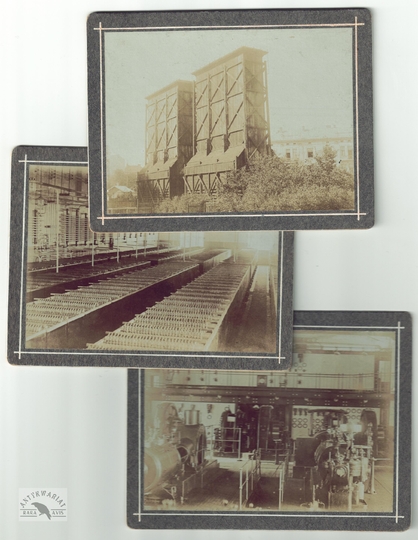 [LWÓW - elektrownia do zasilenia miejskich tramwajów - fotografie widokowe]. [pocz. XX w.]. Zestaw 3 fotografii form. ca 8x11 cm na oryg. podkładach form. 10x13 cm.