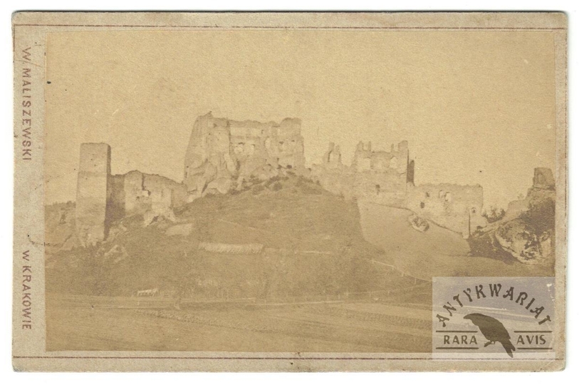 [ODRZYKOŃ - ruiny zamku Kamieniec - fotografia widokowa - ujęcie w formacie cdv]. [nie po 1856?]. Fotografia form. 5,7x9,1 cm na oryg. podkładzie form. 6,4x9,9 cm, autorstwa W[alerego] Maliszewskiego w Krakowie.