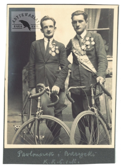 [SPORT - mistrzowie kolarscy z Krakowskiego Klubu Cyklistów i Motorzystów - fotografia sytuacyjna, pozowana]. [1926]. Fotografia form. 10,6x8,3 cm na podkładzie form. 11,9x8,3 cm, nieznanego autorstwa.