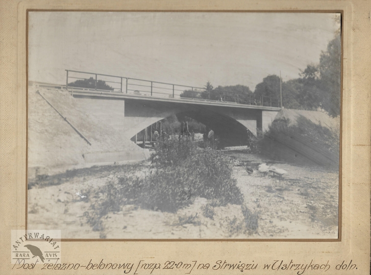 [USTRZYKI Dolne - most żelazno-betonowy [rozp. 22.0 m] na Strwiążu w Ustrzykach doln. - fotografia widokowo-sytuacyjna]. 1925. Fotografia form. 17x23,2 cm na oryg. podkładzie form. 22,5x28 cm.
