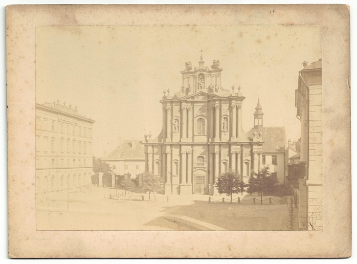 [WARSZAWA - Kościół kościół Sióstr Wizytek pod wezwaniem Opieki św. Józefa Oblubieńca Niepokalanej Bogurodzicy Maryi - fotografia widokowa]. [l. 70. XIX w.?]. Fotografia form. 10,5x14,6 cm na podkładzie form. 13x17,6 cm.