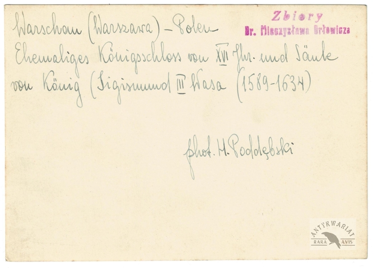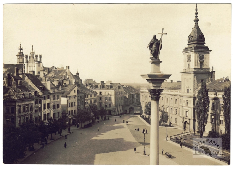 [WARSZAWA - plac zamkowy z kolumną Zygmunta III Wazy - fotografia widokowa i sytuacyjna]. [l. 30. XX w.]. Fotografia form. 12x17,1 cm, autorstwa Henryka Poddębskiego.