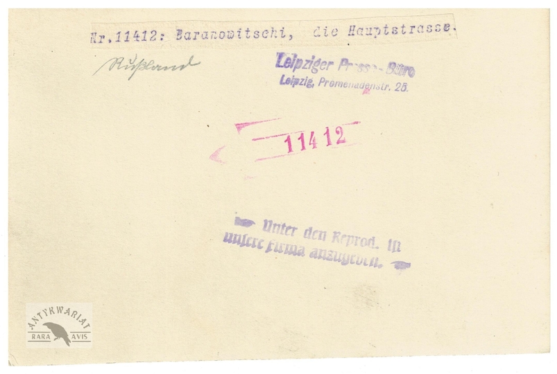 [I WOJNA św. - Baranowicze - ulica Główna - fotografia prasowa]. [1914/1918]. Fotografia form. 11,8x17,8 cm, wykonana na zlecenie Lipskiego Biura Prasowego.