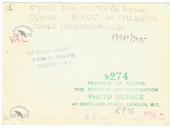 [WOJSKO Polskie - gen. Władysław Sikorski i Prezydent Czechosłowacji Edward Benesz w Kineton podczas przeglądu wojsk - fotografia sytuacyjna]. [27 I 1941]. Fotografia form. 12,1x16,6 cm.