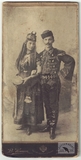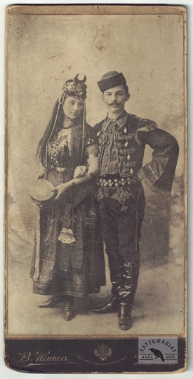 [FOTOGRAFIA portretowa - para w stylizowanych na wschodnie strojach - ujęcie w formacie gabinetowym]. [nie przed 1905, nie po 1910]. Fotografia form. 17,7x9,8 cm na oryg. podkładzie form. 20,4x10,1 cm, autorstwa Bernarda Hennera (młodszego) w Krakowie.