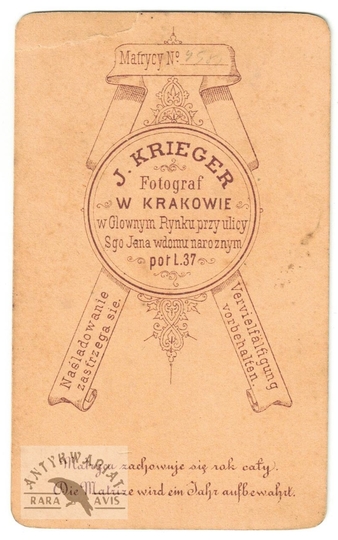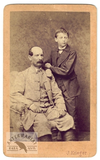 [FOTOGRAFIA portretowa - ojciec z synem - ujęcie w formacie cdv]. [2. poł. XIX w.]. Fotografia form. 8,8x5,5 cm na oryg. podkładzie form. 10,5x6,4 cm, wykonana w atelier Ignacego Kriegera w Krakowie.