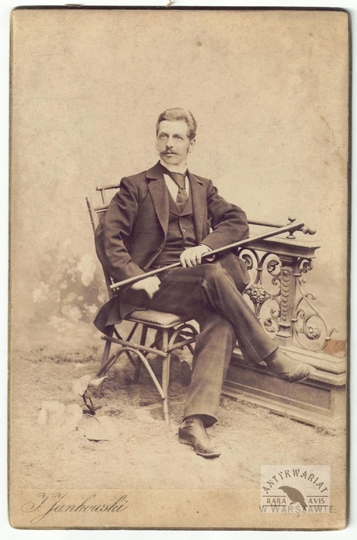 [FOTOGRAFIA portretowa - młody mężczyzna - hr. Makomaski (?) - ujęcie w formacie gabinetowym]. [nie przed 1894, nie po 1898]. Fotografia form. 15x10,6cm na oryg. podkładzie form. 16,2x10,6 cm, wykonana w zakładzie J[ózefa] Jankowskiego w Warszawie.